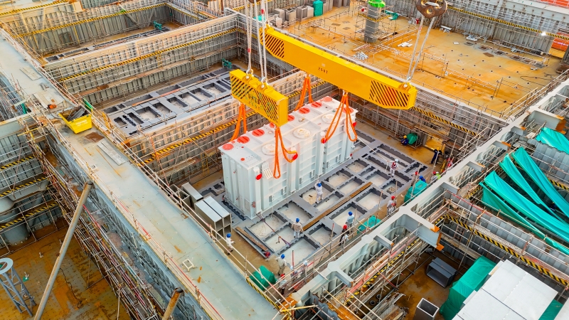 聯(lián)接變壓器是海上換流站的關鍵設備,承擔著海上風電匯集、轉(zhuǎn)換和穩(wěn)定輸出的重要使命。項目共有三臺聯(lián)接變壓器,單體重量約380噸,均需吊裝至高49.6米的海上換流站上部組塊第6層,這是對項目團隊技術(shù)能力和管理水平的綜合考驗。面對挑戰(zhàn),項目團隊將安全與質(zhì)量置于首位,嚴格執(zhí)行大型起重作業(yè)規(guī)范,高效協(xié)同推進吊裝各項工作:吊裝實施前,充分開展三維建模與全過程施工模擬,精心優(yōu)化吊點設置和吊裝路徑,制定了科學周密的專項吊裝方案;吊裝過程中,引入實時應力及變形監(jiān)測系統(tǒng),對設備本體和吊具狀態(tài)進行動態(tài)監(jiān)控,精準把控關鍵參數(shù);吊裝下降前,利用激光定位儀輔助設備精準對位。整個吊裝過程安全可控、質(zhì)量合規(guī)、一次精準到位,成功實現(xiàn)了預期目標。